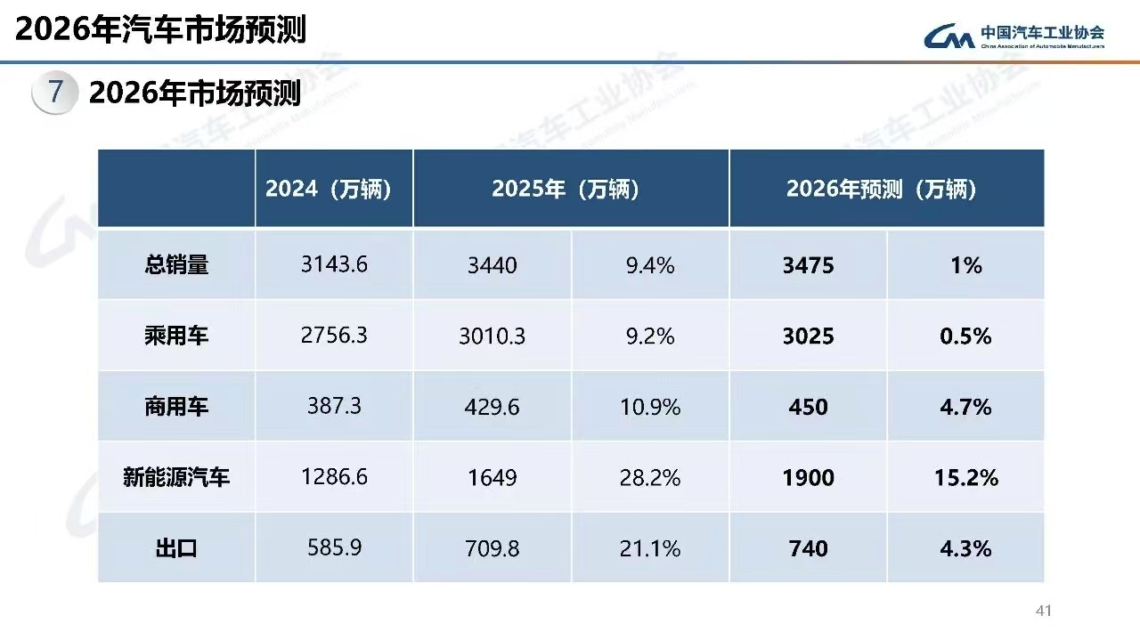 展望2026年,陈士华分析,“两新”政策平稳有序衔接,9部门联合印发的《关于实施绿色消费推进行动的通知》,将加快发展方式和消费模式绿色转型,这将稳定市场预期,提振汽车消费。与此同时,汽车行业反内卷也取得初步成效。2026年,中国汽车产业将持续推进高质量发展,整体市场保持稳健运行,预计全年有望实现总销量3475万辆股门在线,其中新能源汽车销量1900万辆。